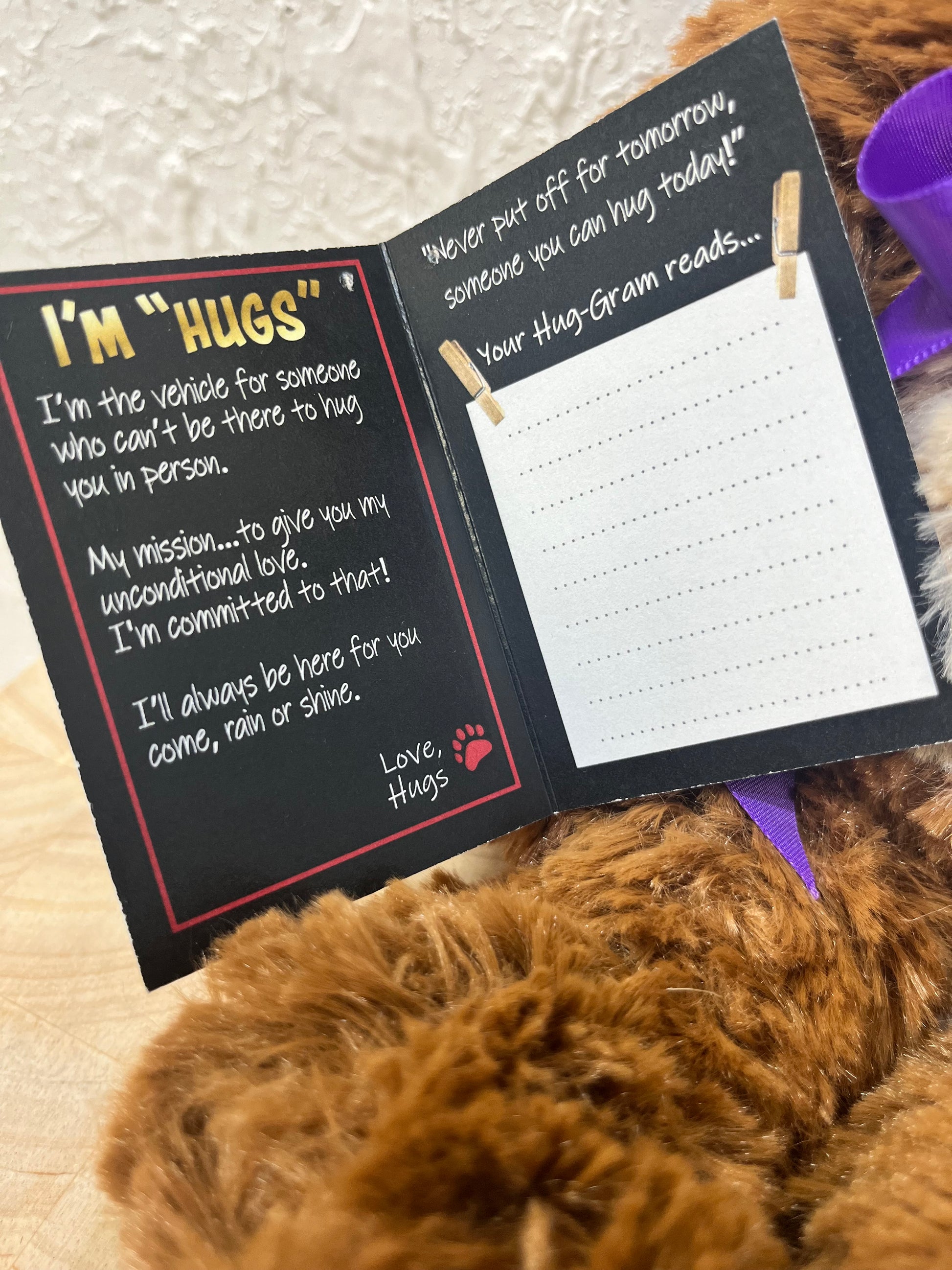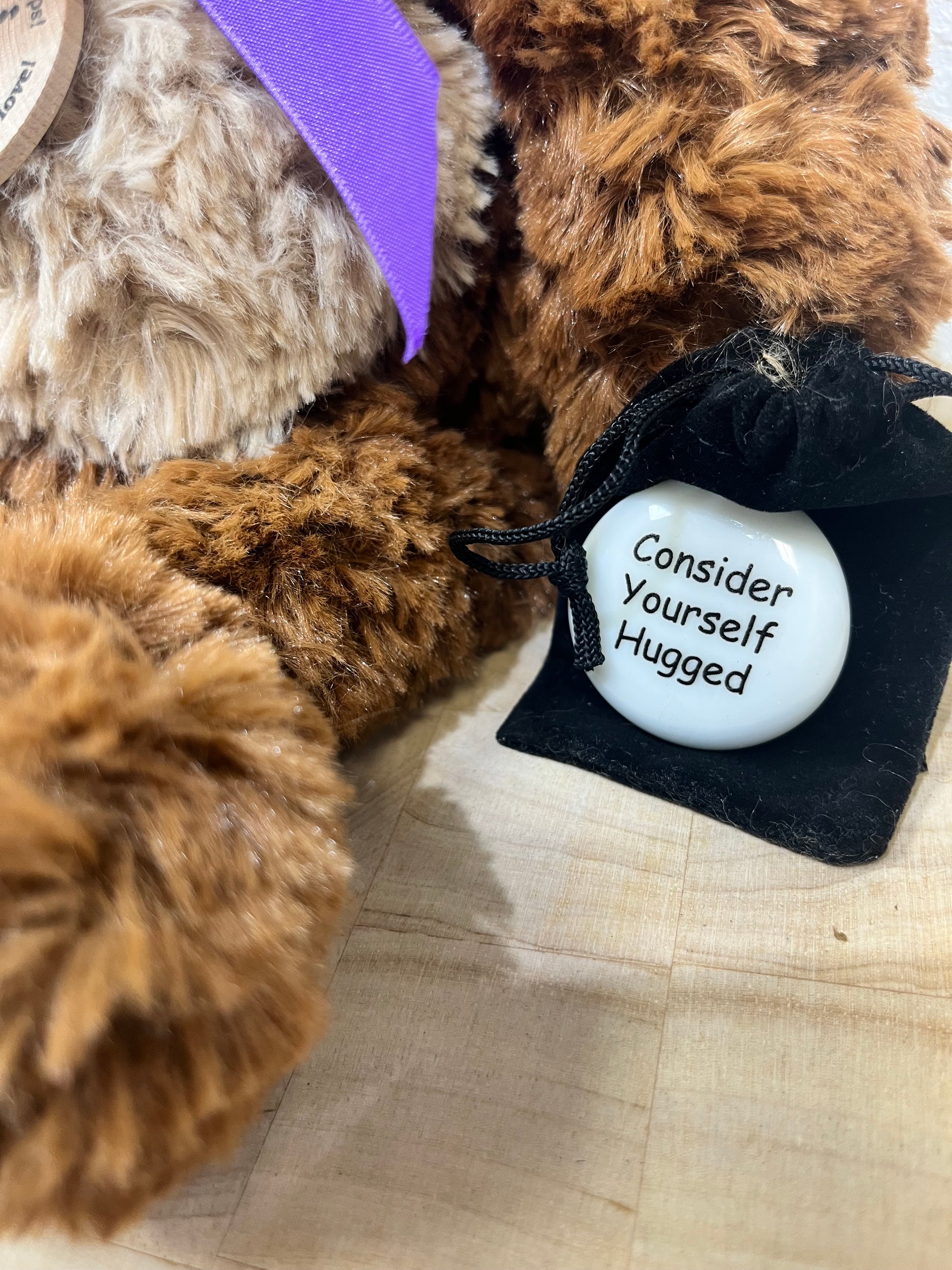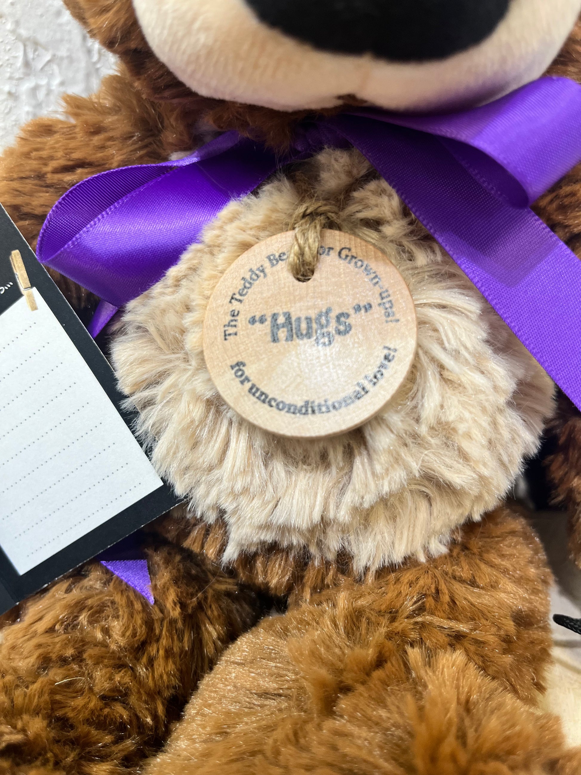Our Small HUGS bear is the perfect messenger of love and light. Wrapped in warmth and confetti, this adorable plush bear carries a symbolic engraved stone and a personalized card that says it all: “I’m here for you — always.” Whether it’s a birthday, recovery, or just because, this bear of hugs and love is designed to remind someone special that they matter. A thoughtful alternative to flowers that lasts forever.